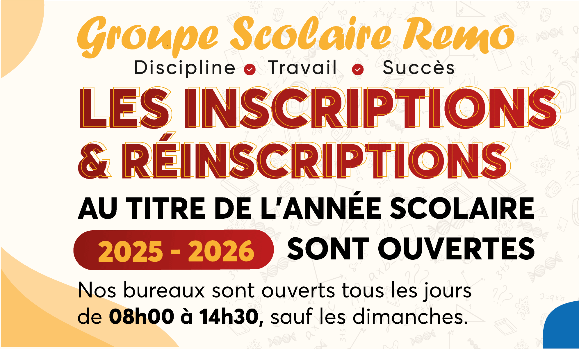 Le Groupe Scolaire REMO est fier et heureux d’annoncer l’ouverture officielle des inscriptions et réinscriptions pour la prochaine année scolaire. Fidèle à notre engagement en faveur de la Discipline, du Travail et du Succès, nous nous préparons à accueillir une nouvelle vague d’élèves désireux d’apprendre, de grandir et de s’épanouir dans un environnement propice à...Read More